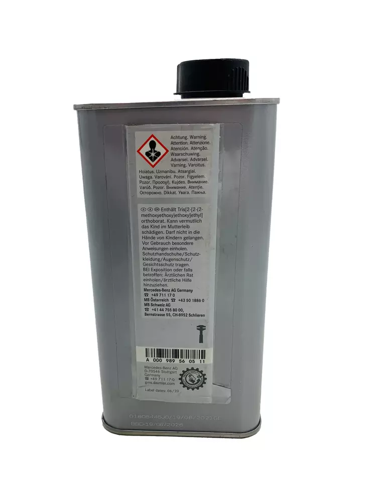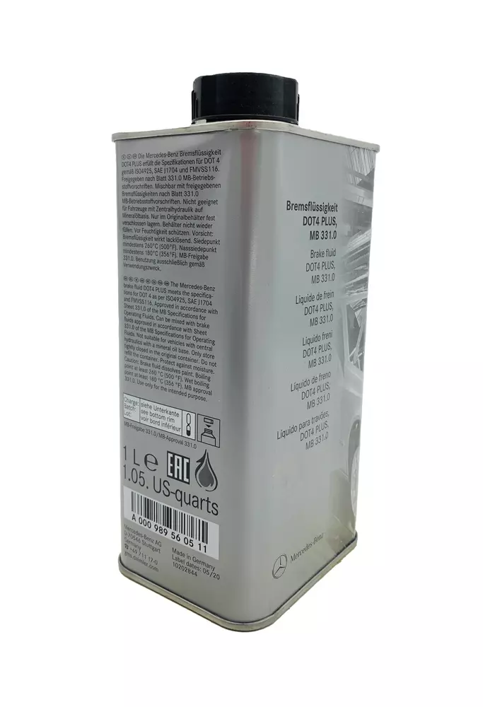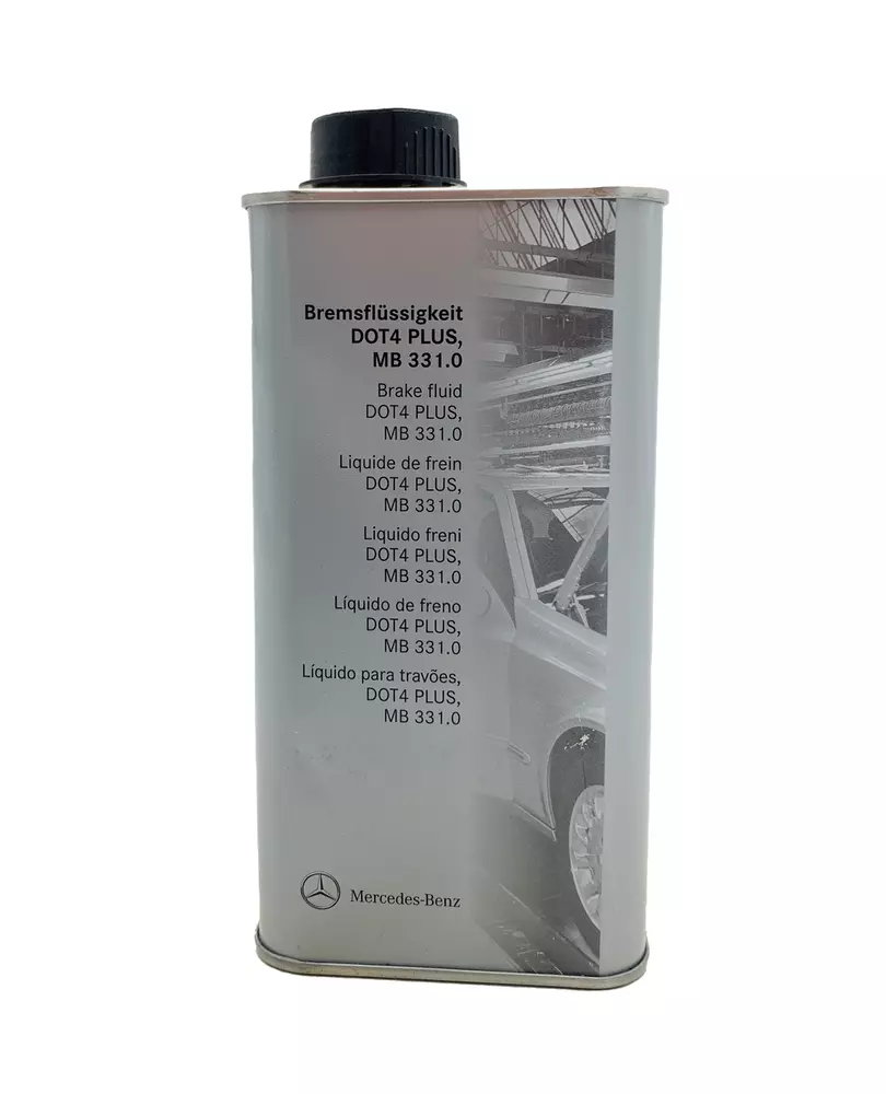 Mercedes - Benz DOT4 Plus (331.0) - оригінальна гальмівна рідина, призначена для гідравлічних гальмівних систем автомобілів Mercedes, - Benz. Відповідає допуску MB 331.0. Гарантує стабільну роботу гальмівної системи, захищає її елементи від корозії і передчасного зносу. Оригінальна рідина Mercedes - Benz DOT 4 Плюс витримує великі фізичні навантаження і термальні перепади (завдяки високій точці кипіння), зберігає свої властивості упродовж усього експлуатаційного терміну.